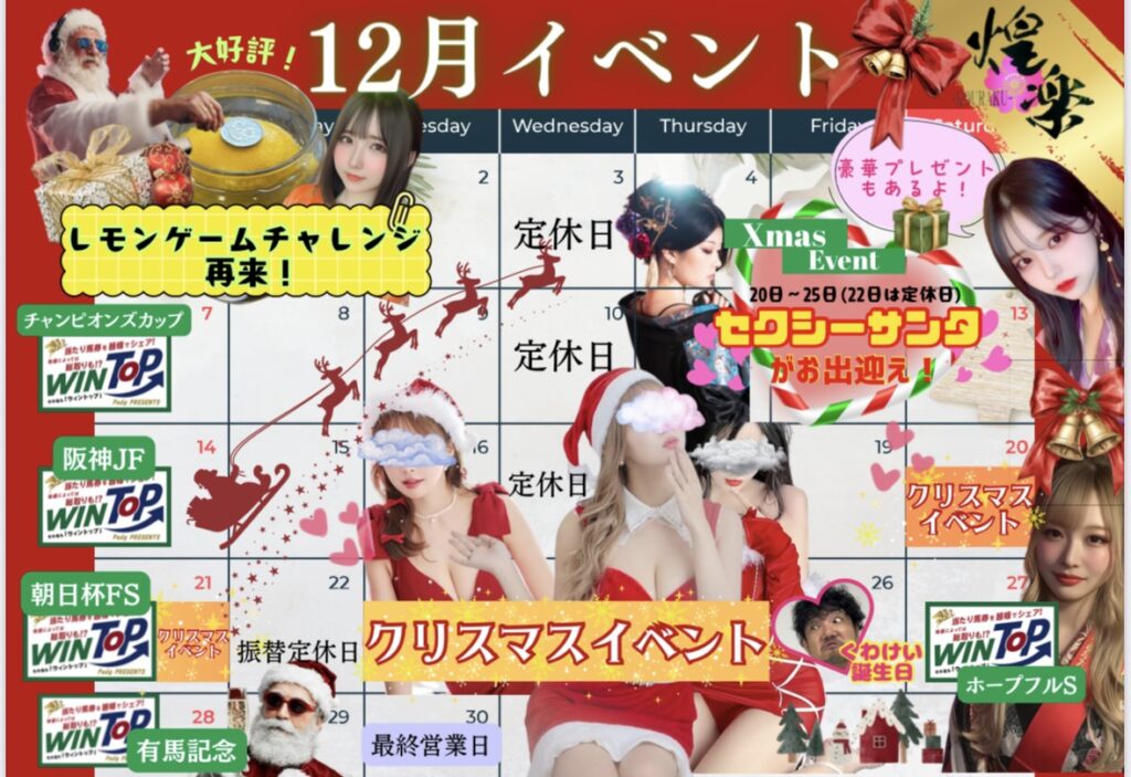 ジャパンカップ👑G1】【9周年御礼】【12月カレンダー】 ジャパンカップ2025‼… 続きを読む: 12月はイベント盛り沢山!セクシーサンタがお出迎え! - 煌楽の9周年はSwitchが当たってお得に遊べる!!